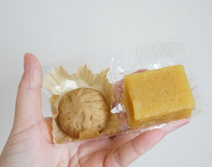 ・一番下の土台は、一見、しっとり系のクッキーやスポンジかのように見えますが、こちらも湯煎焼きをした焼きマロンクリームあんでした!モンブランに乗っている栗の甘露煮かなってくらい濃厚な栗感が感じられます。
