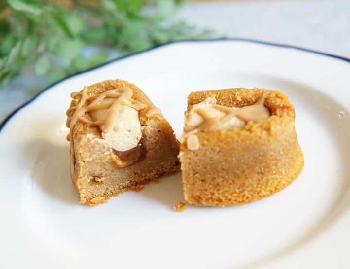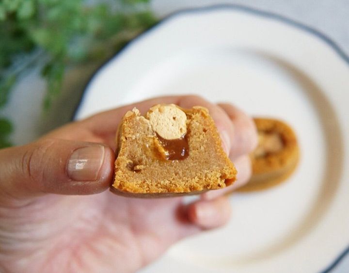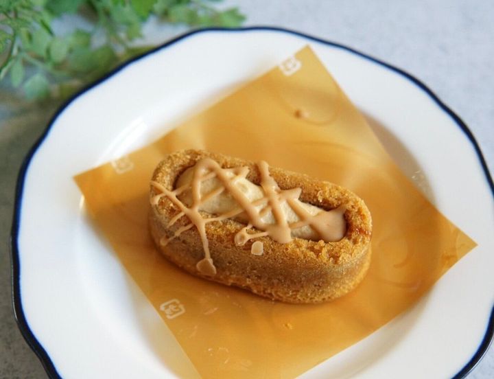 カットしてみると、さらに中からとろりとキャラメルソースがお目見えします。こういう場合、生キャラメルのようなネットリ系ソースになるのかなと想像していましたが、予想に反しさらっとした系のソースで、それがまたうまい具合に周りに絡みつき、口の中でキャラメル感をより膨らませてくれます。