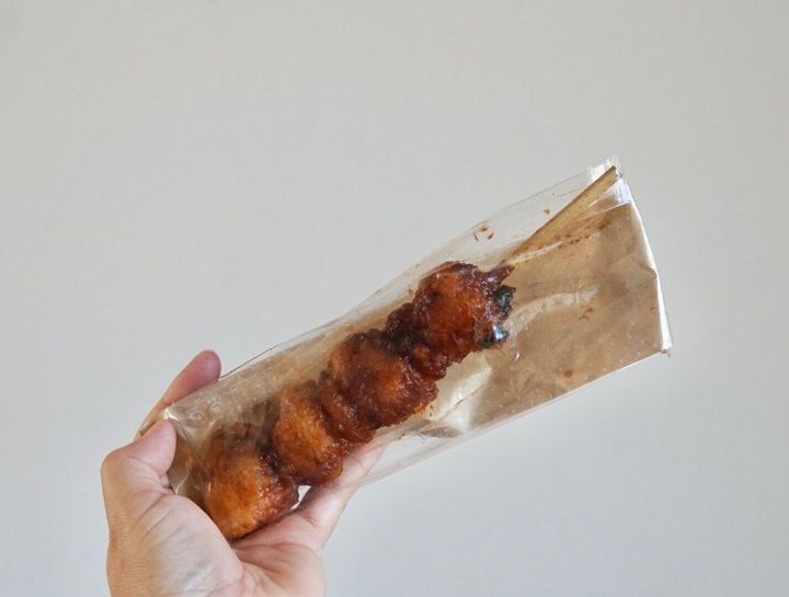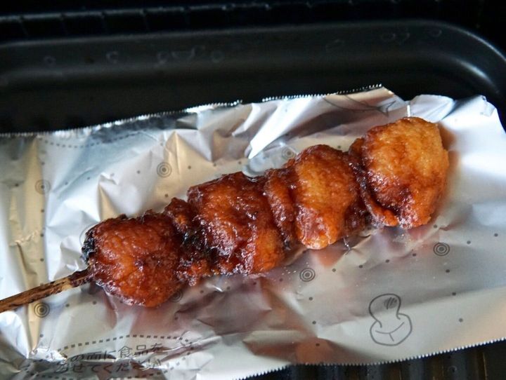 今回は、「タレから棒」つまりは、ヤンニョム味のタレがかかった唐揚げ棒が販売されています。小ぶりの唐揚げが4個串にささっており、たっぷりとタレが絡んでいるのが本当に美味しそうで思わず手にとりました。