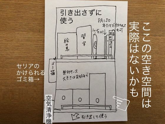 また、こちらの棚を利用されているお子様は、たぶんですが面倒なことが苦手で、使わないものでもひとまず空いている隙間に突っ込んでいるようにお見受けします。なので、セリアなどでも購入できる壁にフックをつけてそのままかけられる専用ゴミ箱をすぐ横に設置して、使わないモノやゴミはすぐに捨てられる環境を整えてあげたらどうかなと思います。