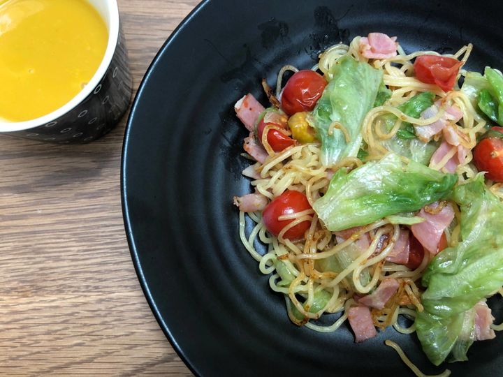 その名の通りです。豚バラがなく、ベーコンがあったので、キャベツではなくレタスとミニトマトで作ってみました。ベーコンと麺を炒めてほとんど完成したときにちぎったレタスと半分に切ったミニトマトを入れて炒めます。