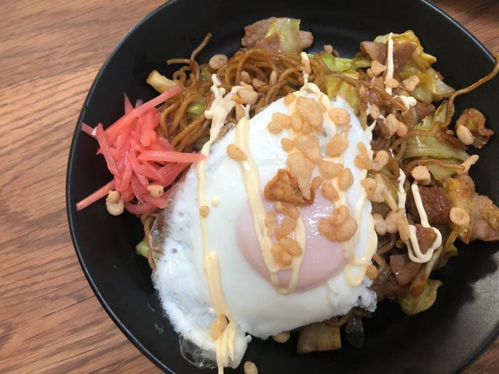 スタンダードなマルちゃん焼そばを作って、上に目玉焼きを乗せて、天かすパラパラ、仕上げにマヨネーズと紅生姜。