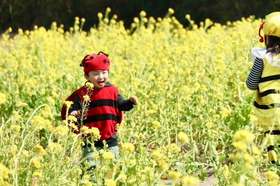 着ぐるみの貸し出しもあり、てんとう虫やミツバチになって記念撮影をすることができます。菜の花畑で遊ぶ小さな虫さんたちはかわいすぎて何枚も写真を撮ってしまいますね。