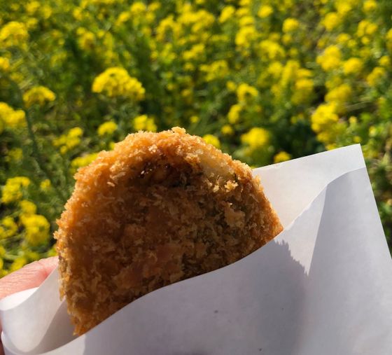 菜の花畑で食べたい菜の花グルメも充実しています。おすすめは「菜の花コロッケ」。揚げたてのサクサクを食べることができます。