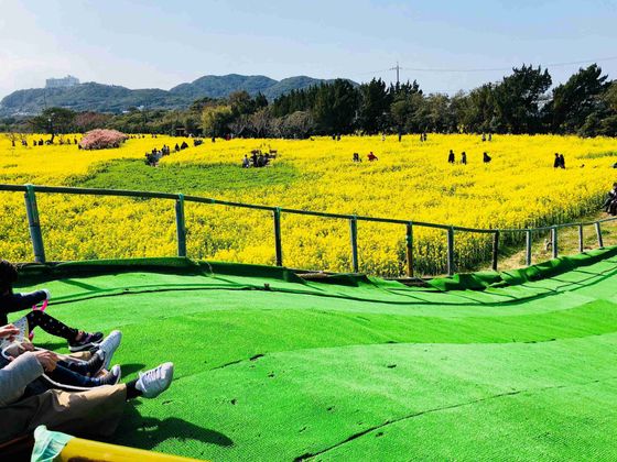 眼下に臨む一面の菜の花を見ながらの芝そりはこのイベントならではの楽しみです!