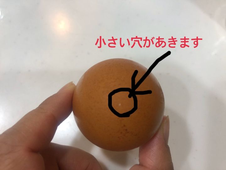 卵の丸い方を下に向けておきます。少し力を入れて卵を押すだけ。小2の娘でも簡単に穴を開けることができました。