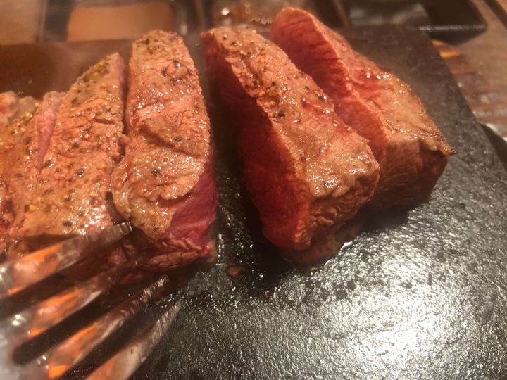 お肉を切ってみるとめちゃくちゃ柔らかい。スッとナイフが入ります。レアの状態で運ばれてくるのでお好みの焼き加減で召し上がれ。