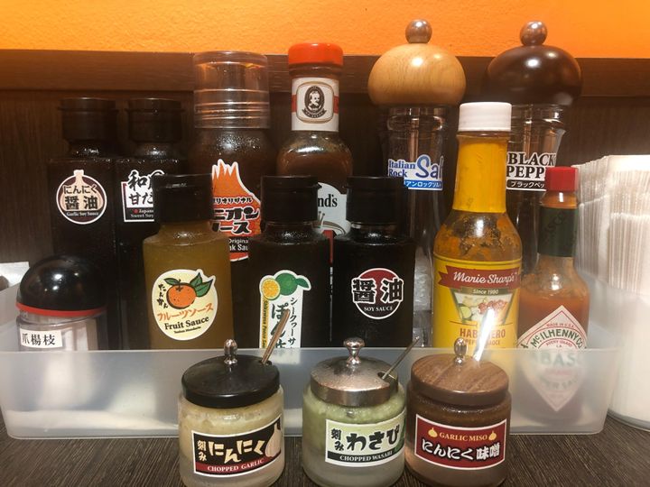 にんにく醤油やオニオンソースなどの定番の他に沖縄県ではメジャーだという酸味のあるA1ソース、たんかんソースなど。わさびや刻みニンニクもあるのでお好みでトッピングを楽しんでみてください。
