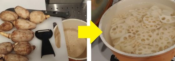 蓮根・ゴボウ:切ったそばから酢水にさらし、そのまま茹でます。