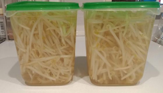 もやし:タッパーに水を張って保存。冬場は2日、夏場は毎日水を換えればシャキシャキ感が長持ちします。