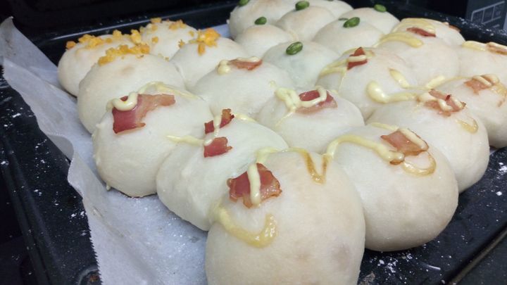 成形したパンの上に、バター(実際はマーガリン)を塗り、グラニュー糖をまぶす。ほんのり焦げたくらいが美味しいです。