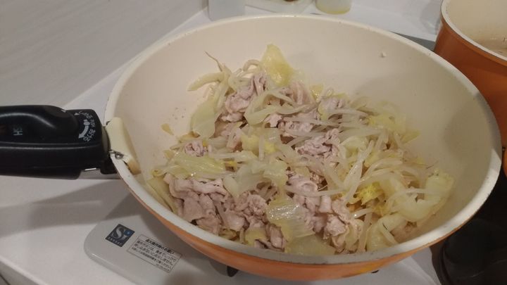 1.野菜と豚肉を同じ鍋で茹でる(筆者は野菜に火が通ったら豚肉を入れています)