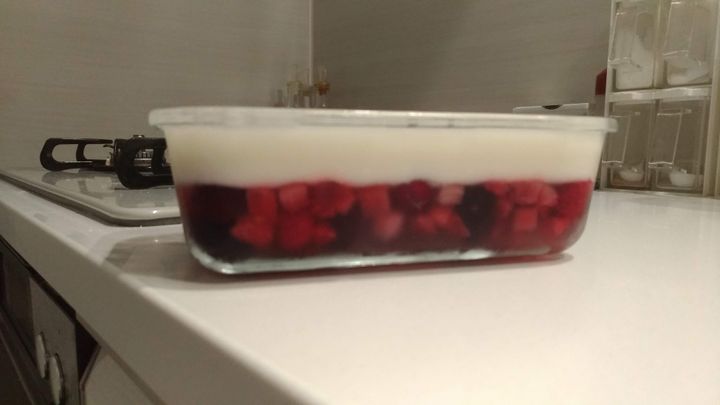 3.冷凍ミックスベリーの効果で、既に下の層は固まっています(作っててビックリした)。同じ容器にそっと流し入れ、冷蔵庫で冷やし固めます。