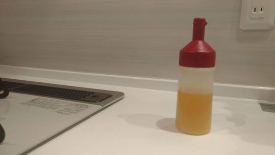 というわけで(?)、仲間外れ状態になってしまったこの子。現在ではオイルポット代わりにしています。油がある程度冷めたら、キッチンペーパーで濃しながら注ぐだけ。オイルポットの代用品にもなるオイルボトル、こんな使い方も出来ますよって話でした。