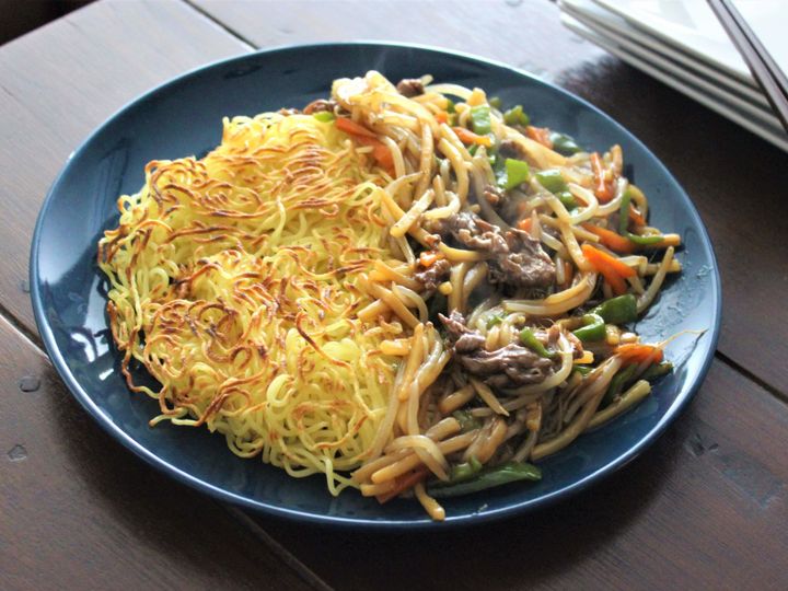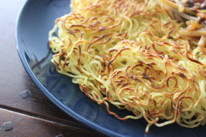 1.焼きそば麺をフライパンにうすく広げ、こんがり焼きつける。焼き色が付いたら取り出す。(↓に詳しい説明あります)