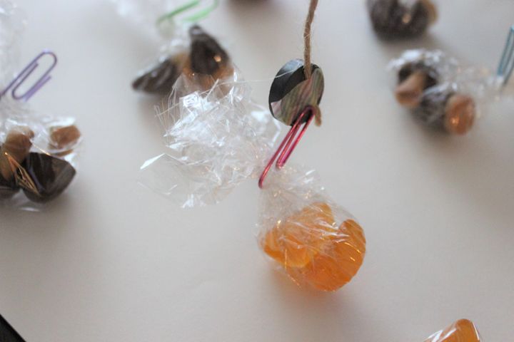 釣りに飽きたら、クリップにひもを結び付けて、どのお菓子が当たるかわからないくじ引きにしても。