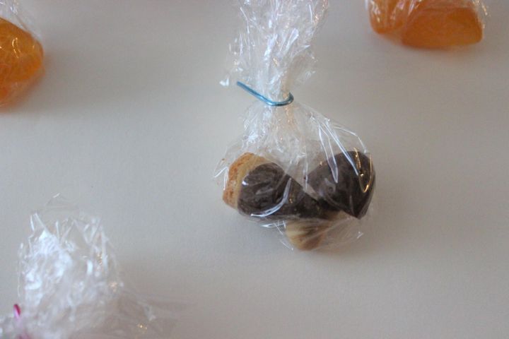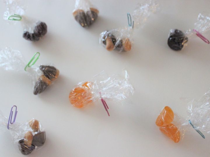 お菓子をこわけにしてラップで包み、クリップでとめるだけ。