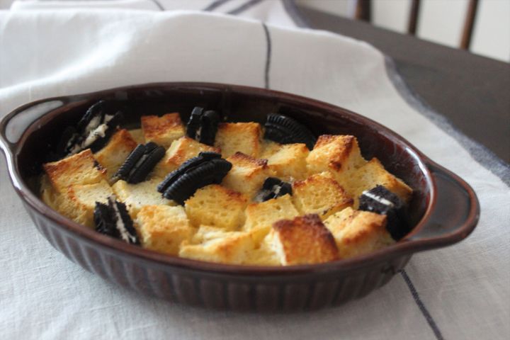 2.食パン、オレオは一口大に切り、油を塗った耐熱皿に並べる。