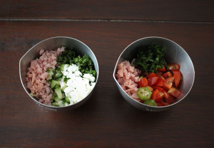2.ミニトマト(10個)+茹でオクラ(2本)+大葉(2枚)+ハム(1枚)