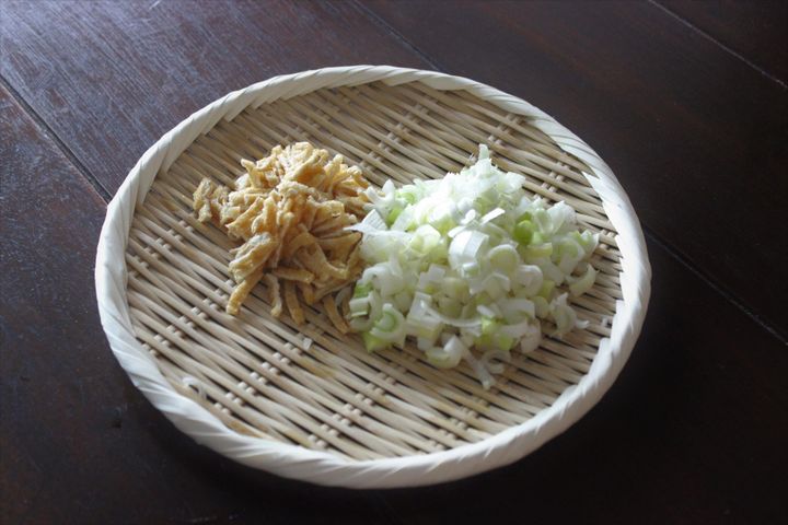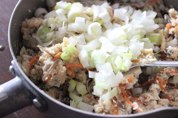1.油揚げは縦半分に切った後千切り、長ねぎは粗く刻む。卯の花の煎りには油分が少し多いほうがおいしく仕上がるので、油臭さがなければ油揚げは油抜き不要。