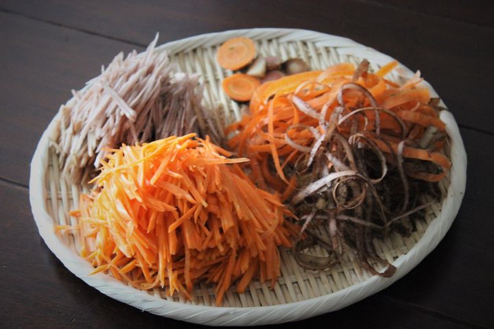 1.ごぼうは皮をこすって洗いささがきに、にんじんは皮をむいて千切りにする。