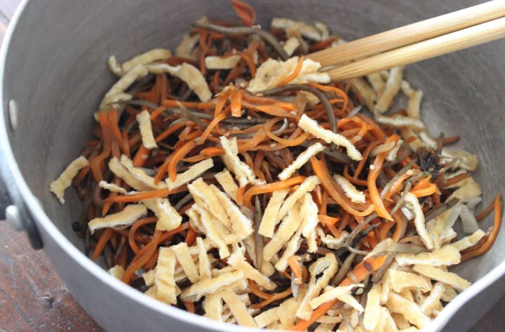 2.フライパンに胡麻油を熱し、ごぼう、にんじんを入れて炒める。全体がしんなりしたら砂糖、醤油、酒を加えてさらに炒める。汁気がなくなり調味料が全体になじんだら火を止め、白炒りごまをふりかける。