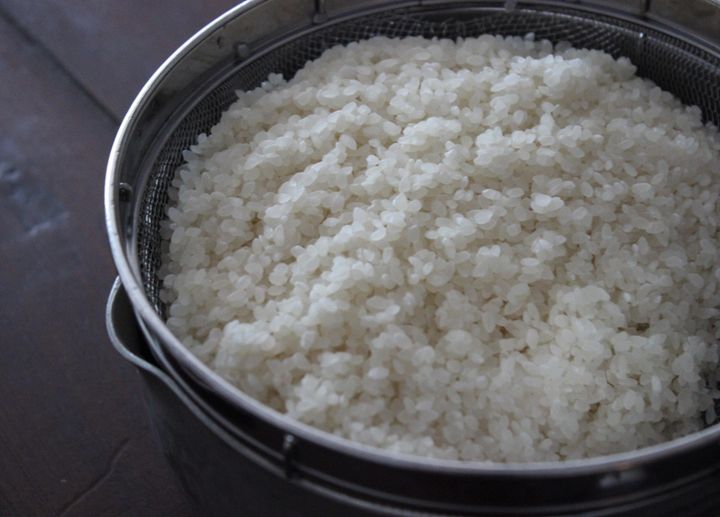 5.切り餅を米の上に広げ、冷めた4を注ぎ入れ、通常通りの水加減に調整して炊飯する。