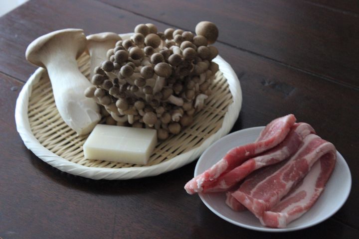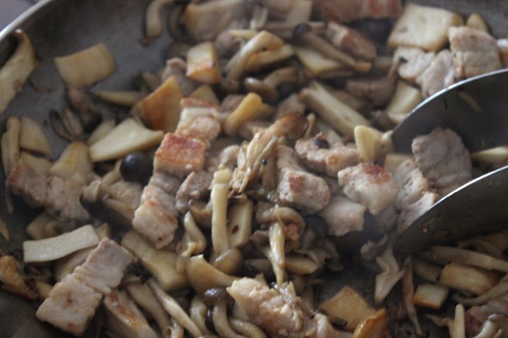 3.フライパンにサラダ油を熱し、豚バラ肉→きのこの順に焼き色が軽くつくまで炒める。