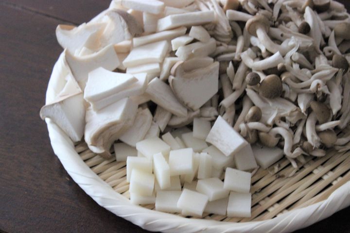 2.豚バラ肉ときのこはキッチンバサミで一口大に切り、切り餅は細かく刻む。