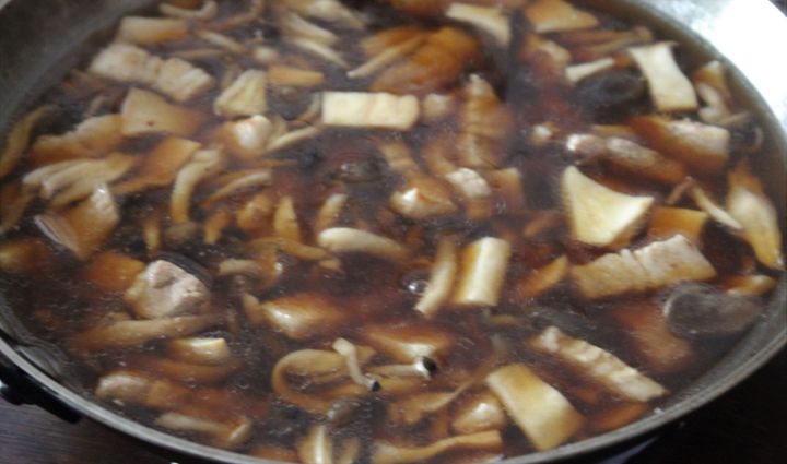 4.水2カップ、酒大さじ3、鶏がらスープの素小さじ2、砂糖小さじ2、醤油大さじ3.5、塩小さじ1/2を加えて煮立たせ、アクを除いて火を止め、冷ます。(炒める過程でフライパンについたこんがり焼けたきのこや豚肉もこそげてスープに取りました)