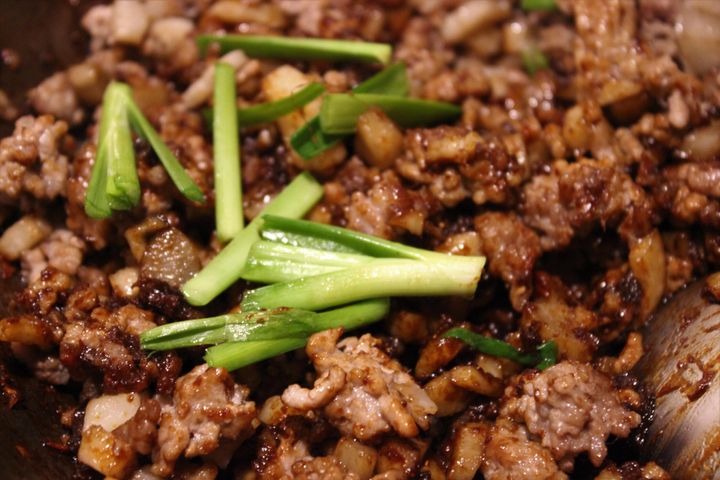 3.豚挽肉を加え、あまりいじらずにごろごろと塊が残るように炒める。肉に火が通ったら余計な油を取り除く。