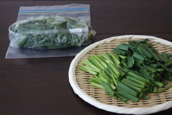 我が家はシャキッとしたニラが好きなので、ニラを入れる前の状態で保存し、食べるときにニラを加えることが多いです。