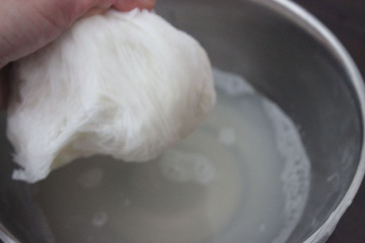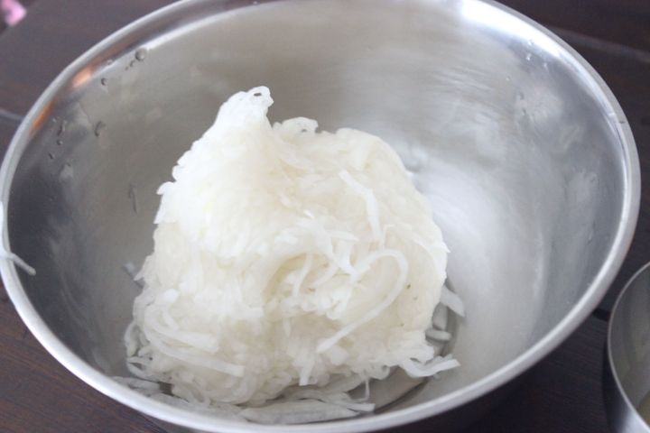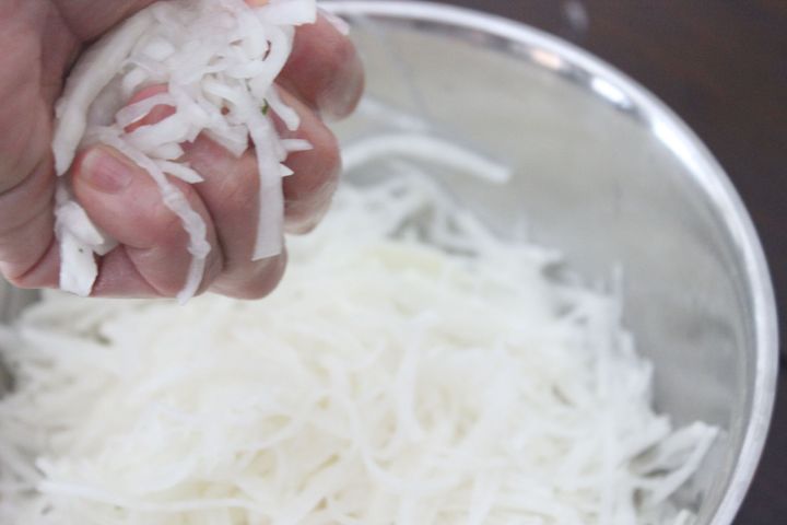 5.大根の水気を徹底的に絞る。手に収まる程度の量ずつに分けて少しずつ絞った後、キッチンペーパーなどに包んでぎゅーっと絞ると水気が上手に切れ、味もぼやけず、食感良くおいしく仕上がります。