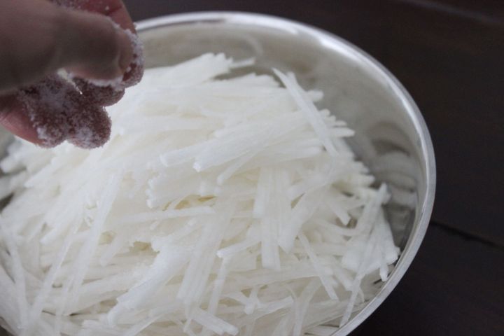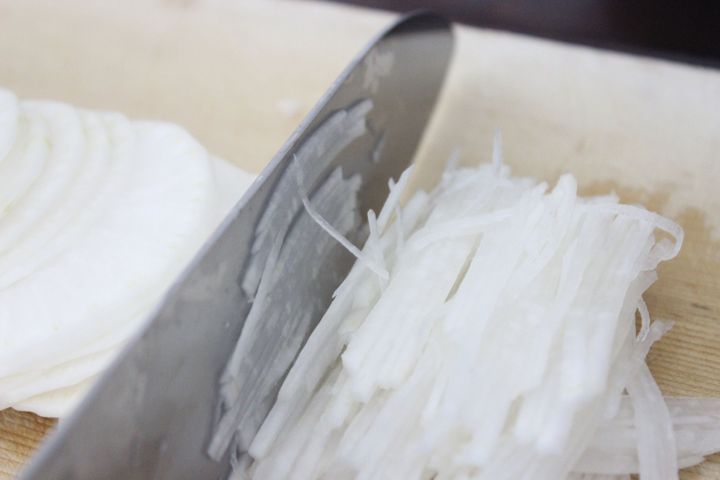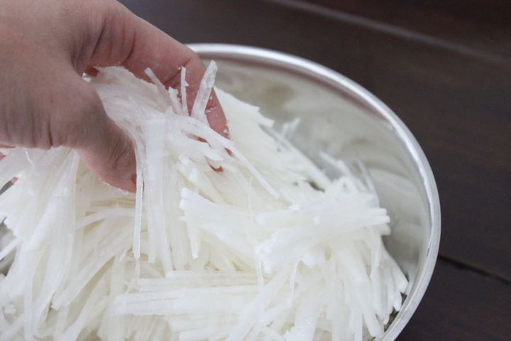 2.薄切りした大根を細い千切りにする。リズミカルに急いで切ろうとせず、同じ場所を何度も切るようにして刻むと細く切ることができます。