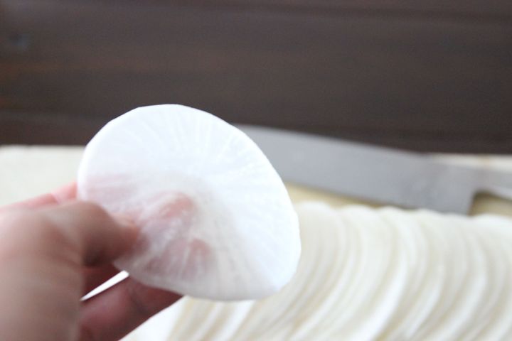 1.大根を透けるくらい薄い輪切りにする。スライサーなどを使うと時短&簡単です。