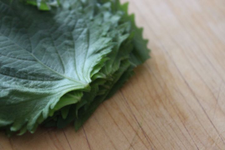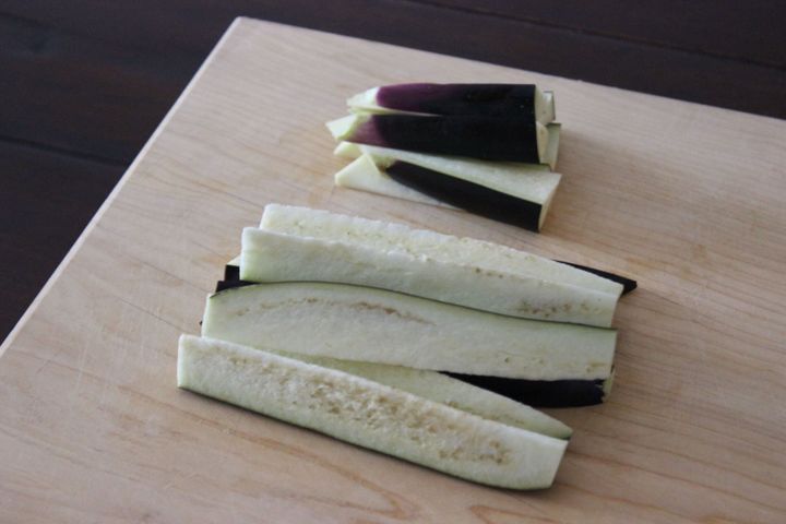 1.茄子は春巻きの皮のサイズにあわせてスティック状に10等分に切り、大葉は茎を切り落とす。