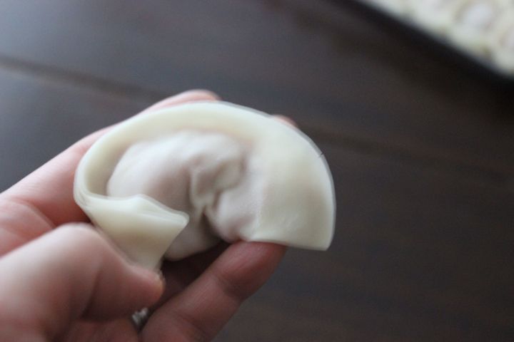 餃子は包むのが大変な献立ですが、写真のように具材を包んで両端を重ねるだけならとっても簡単。子供のお手伝いにもぴったりです。