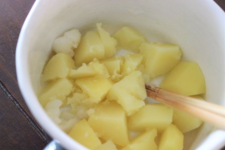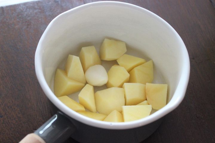 じゃがいもとにんにくを一緒に茹でて、火が通り柔らかくなったら水分を飛ばしながらマッシュします。(写真は、じゃがいも大2個ににんにく1かけを入れていますが、にんにくは1/2かけくらいで良いかもしれません。この日はガツンとにんにくを食べたい日でした…。)