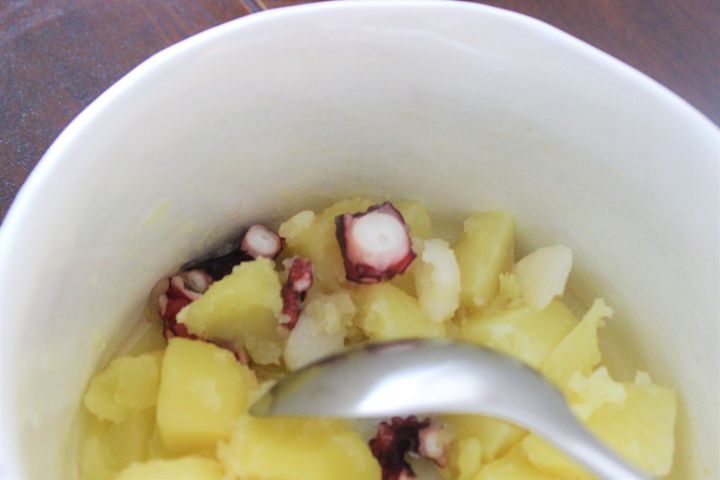 そこにゆでだこ(どのような切り方でも)を加え、なじませます。塩で味を整え、トーストで挟んで完成。オープンサンドにしても。