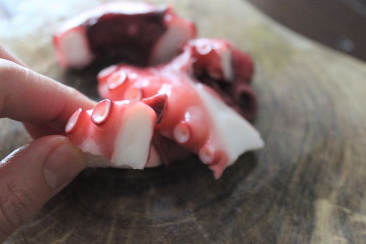 2.ゆでだこは薄切りにする。(太い部分は半分の太さに切ってから薄切りに)