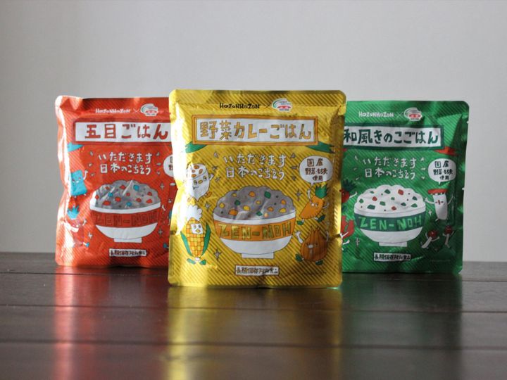 「全農オリジナル防災食 五目ごはん、野菜カレーごはん、和風きのこごはん」をご紹介いただきましたが、まずはパッケージにびっくり。