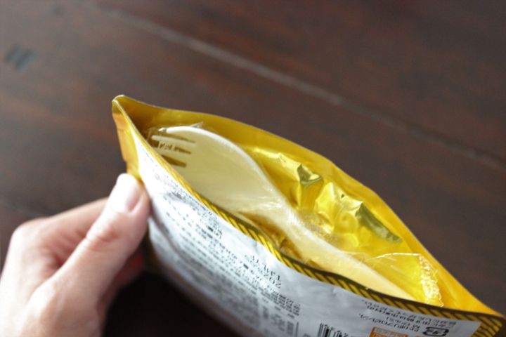 底の部分にかさばらないよう工夫されてスプーンがついており、この商品さえあれば、防災食もカトラリーも全部そろうようになっています。