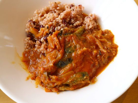 後は飴色玉ねぎにトマト、スパイス、ココナツミルクで煮込んだらサバカレーの出来上がり。
