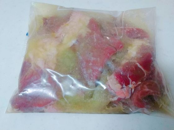 ②ジップロック等の保存袋にステーキ肉を入れ、すりおろした玉ねぎを入れます。