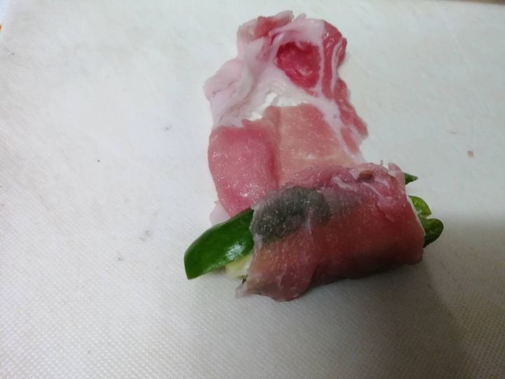 4、3の状態のししとうを豚肉でクルクルと巻いていきます。