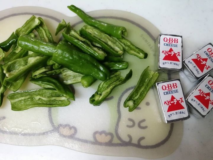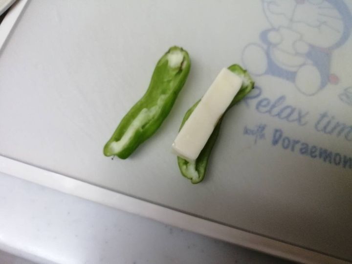 3、ししとうの間にプロセスチーズを挟みます。