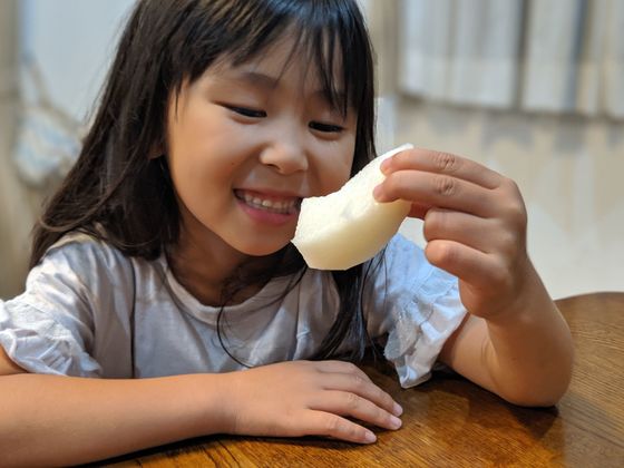 いきなり娘の顔が隠れちゃう大きな大きなこちらは梨!