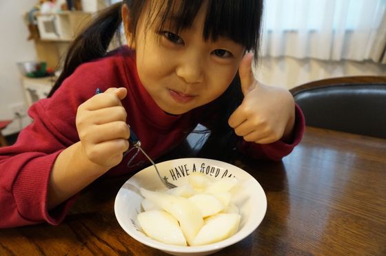 カットしたお餅を娘がパラパラと入れてくれてます。