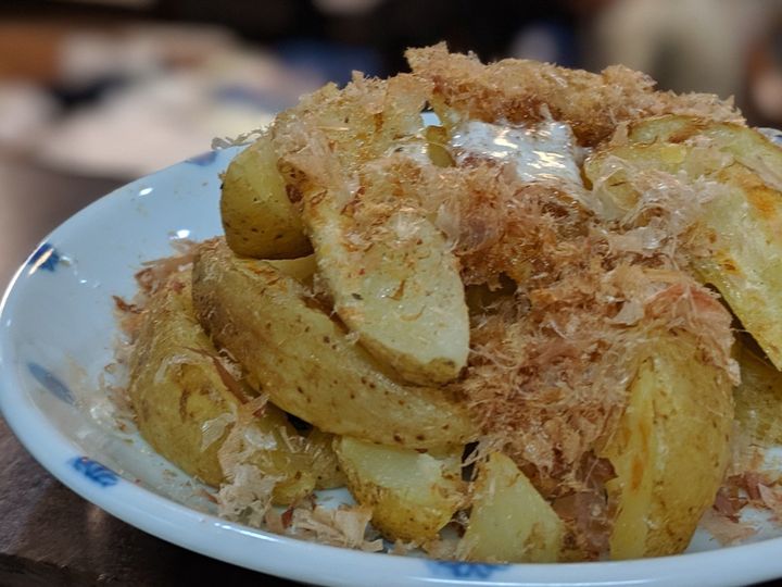 ポテトにバターをのせて鰹節と岩塩を振りかけたポテト。