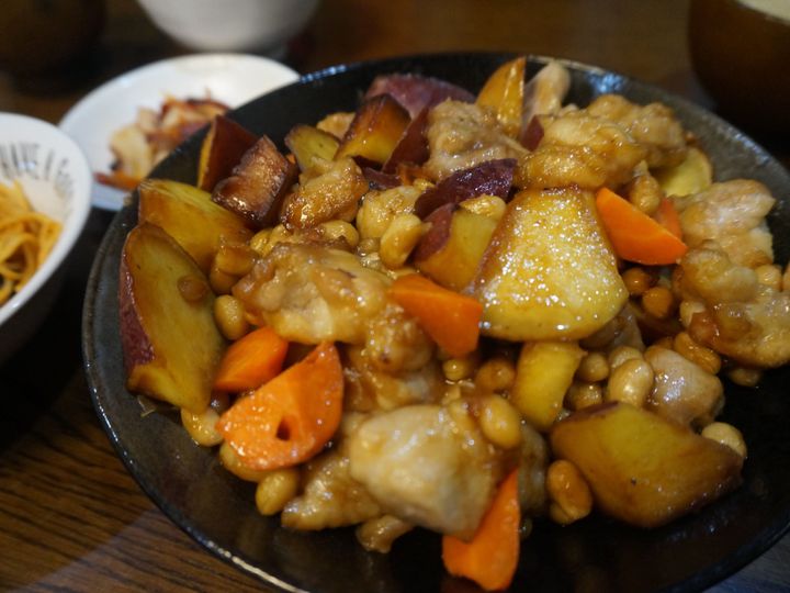 いもジェンヌの甘みと鶏肉と絡まったたれのあまじょっぱさがなんとも言えず♡